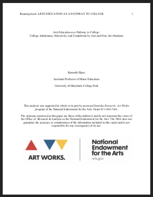 The purpose of this study was to examine the value and positive impact of arts education on the college attainment of students in the United States. Students who have pursued formal arts education courses in the first three years of high school—that is, prior to applying to college— were compared with their non-arts peers on their participation in the college admission process, their success in the college admission process, the selectivity of colleges applied to and admitted at, choice of major, scholarship receipt, on-time bachelor’s degree completion, and total higher education attainment by age 26. Additionally, to contextualize the findings of the present study, college outcomes of arts students were compared with students involved in high school athletics.